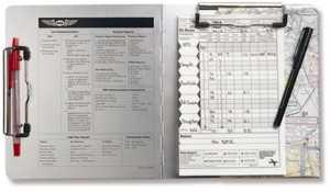 This 9"x16" flying desk has 2 large clips to hold in-flight necessities such as charts, flightlogs, and approach plates. Lost communications procedures for both VFR and IFR, light gun signals, position reports, frequencies, and transponder codes are silk-screened on the brushed aluminum lapboard for quick reference during emergencies. It folds in half when less space is needed and for convenient storage. Foam strips on the back keep the lapboard comfortably in place.